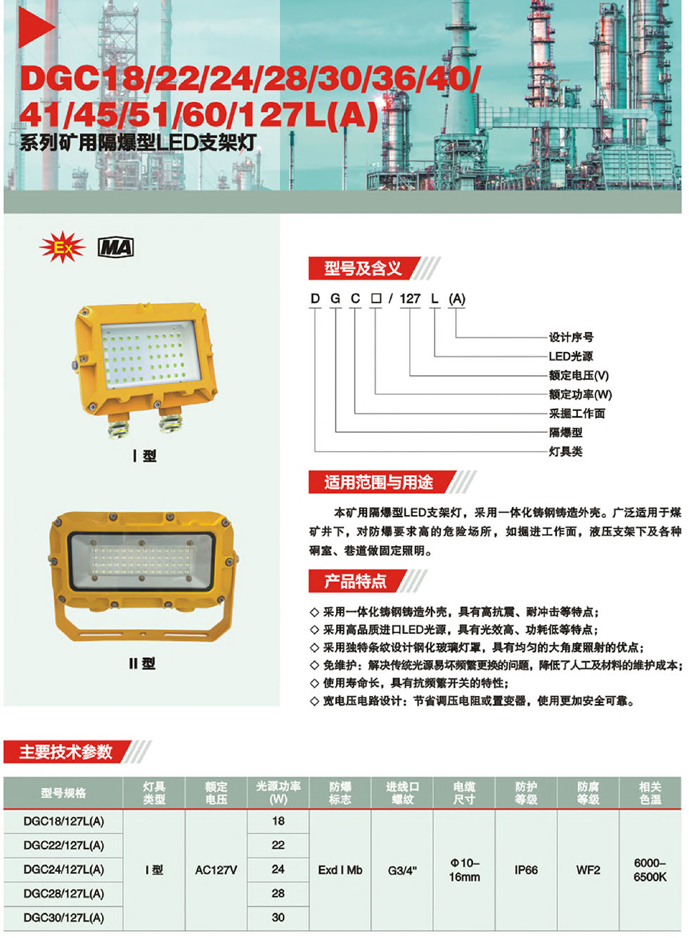 DGS18/22/24/28/28/30/36/40/41/45/51/60/127L(A) 礦用隔爆型LED支架燈