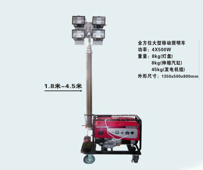 ●照射范圍:選用三節伸縮氣缸作為升降調節方式,更大高度為4.5米,上下轉動控制箱可調節光束照射角度,燈光覆蓋半徑達到35-55米。